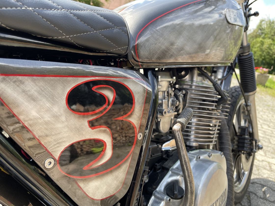 Die XS 400 wurde komplett zerlegt. Zylinder und Ventile neu eingeschliffen, neue Kolbenringe installiert. Der Rahmen wurde neu Pulverbeschichtet.